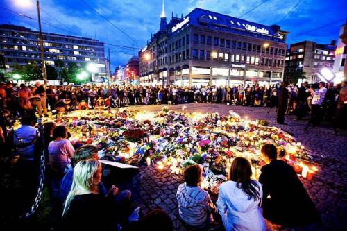 People gathered outside Cathedral Square, Oslo, Saturday night. Photo: Monica Strømdahl / Aftenposten