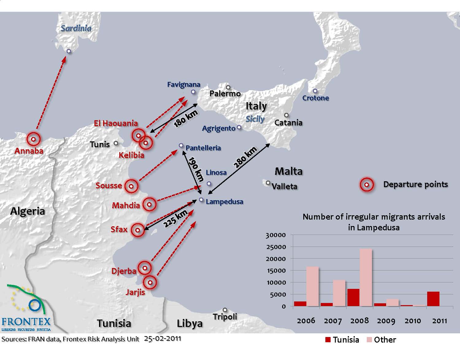 Irregular migration in the Central Mediterranean massively fluctuated in size and composition during 2011, largely due to the political and civil unrest across North Africa, particularly in Tunisia and Libya. Since Q4 2011, the situation has significantly improved following better cooperation between Italian and Tunisian authorities concerning the return of Tunisian nationals.