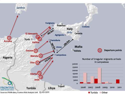 [***] Ranked third among border sections [after the Greece-Turkey land border and the Greece-Albania border section] in Q2 2012 was the blue border of Sicily, where Tunisians, Egyptians and Somalis were increasingly detected. [***]