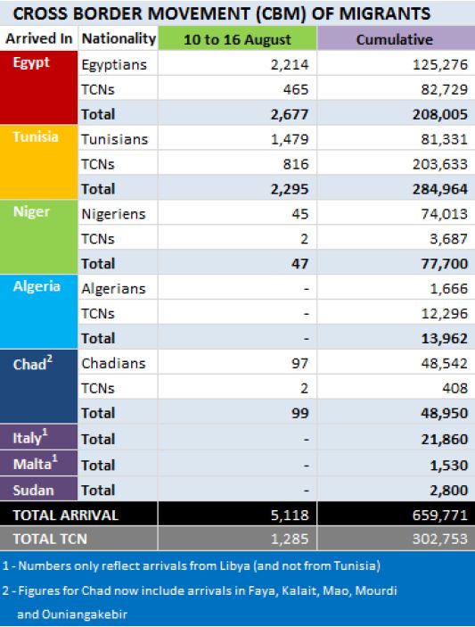 Tunisia received 232,856 individuals from Libya during this period (185,442 of whom were TCNs) which is 43.8% of the total number of migrants who have fled Libya. Egypt received 172,318 individuals (74,911 TCNs) which constitutes 32.4% of the migrants who have fled. Italy received 13,110 individuals (all TCNs) which constitutes 2.5% of the total. Niger received 13.1% of the total, Chad 5.1%, Algeria 2.3%, and Malta 0.3%.