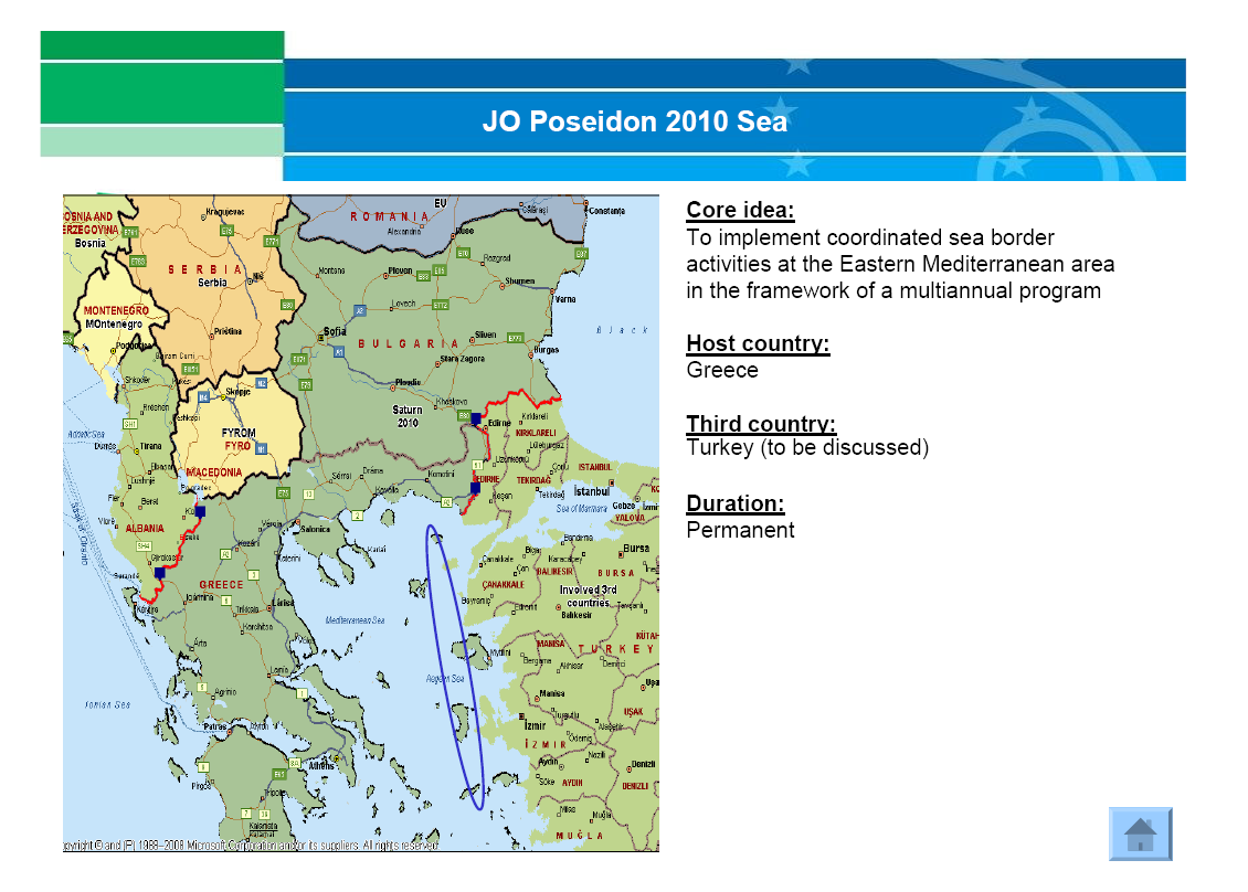 - “JO EPN Aeneas 2012 started on 2 July. The operational plan defines two operational areas, Apulia and Calabria, covering the seashore along the Ionian Sea and part of the Adriatic Sea.”
