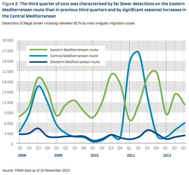 “Overall, in Q3 2012 there were 22 093 detections of illegal border-crossing at the EU level, which is considerably lower than expected based on detections during previous quarters. In fact, there were fewer detections of illegal border-crossing than in any third quarter since data collection began in early 2008. The particularly low number of detections was due to vastly increased operational activity at the Greek land border with Turkey since 30 July 2012, and also to the overlapping effects of the end of the Arab Spring in its initial countries (Egypt, Libya, Tunisia) and far fewer detections of circular Albanian migrants illegally crossing the border into Greece.