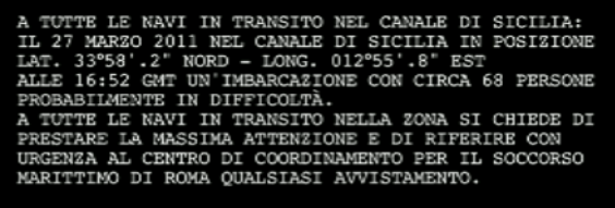 - • At the end of the afternoon of the same day, with little fuel and almost no food and water left and no sight of land, the migrants called Father Zerai, an Eritrean priest based in Rome, by satellite phone to ask for help. After receiving the call, Father Zerai informed of the situation Rome MRCC, which after obtaining the GPS location of the boat at 16:52 GMT from the satellite provider (fig. 2B), informed their Maltese counterparts, NATO’s Naples Maritime HQ and sent out a distress signal to all ships in the area.