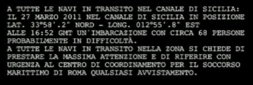 - • In the early morning of 27 March 2011, between 00:00 and 02:00 GMT, a Zodiac-style rubber boat, approximately 10 metres in length with 72 people on-board left the port next to the Medina (Old City) of Tripoli, Libya and headed in the direction of the island of Lampedusa in Southern Italy.