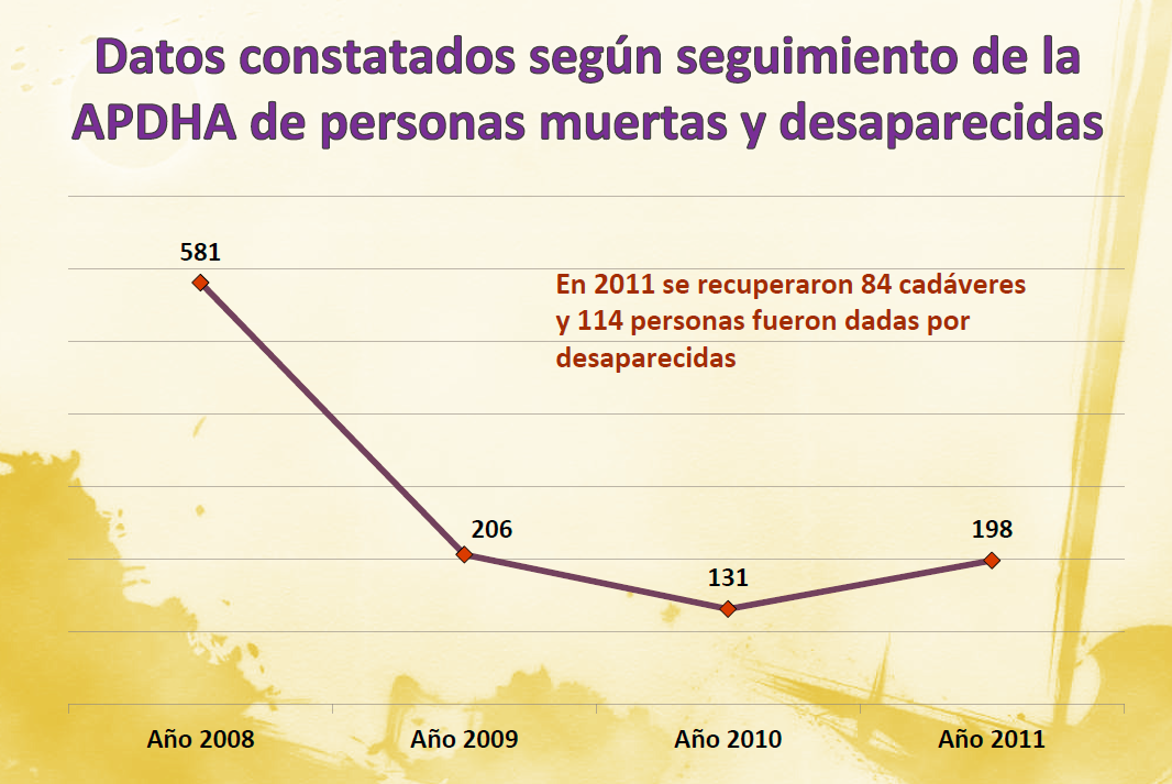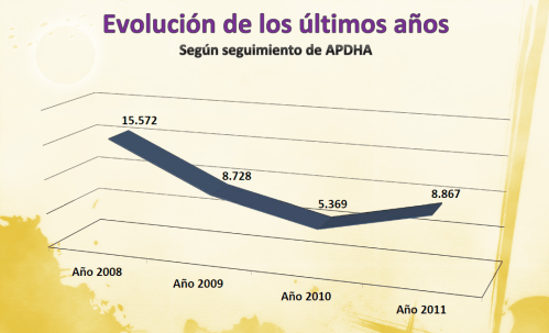 APDHA in its report  issued last month stated that it believed a larger number of migrants reached Spain.  The APDHA report was based on a survey of publicly available information.  It estimates that 8,867 people reached Spain (compared to the 5,443 reported by authorities).  APDHA also reported that 84 migrants are known to have died and at least 114 were known to be missing in 2011.