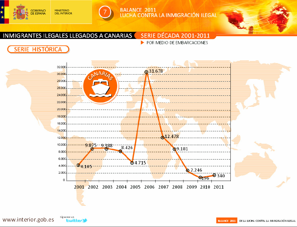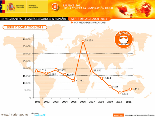 The report from Spanish authorities states that a total of 5,443 migrants were known to have reached Spanish territory by sea, including the Canary Islands, in 2011.  This represents an increase over 2010 when 3,632 persons are known to have arrived, but represents a substantial reduction in total numbers compared to the peak year of 2006 when over 36,000 migrants reached Spain by sea or by entering the North African territories of Ceuta and Melilla.